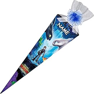 Nestler personalisiert mit Name und Schleife - Schultüte Drachenzähmen 3 - 85 cm - eckig- geheime Welt Lizenz Zuckertüte Dragons Schulanfang Schuleinführung